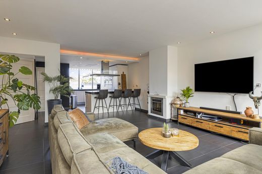 Door de royale, brede uitbouw (8 meter) op de begane grond is er een prachtige riante living ontstaan met veel glas in de achtergevel en een aparte (eet)hoek. De begane grond is voorzien van grote antracietkleurige tegels met vloerverwarming en door de brede raampartijen aan de achterzijde, met openslaande tuindeuren en de geplaatste lichtkoepels, is er bovendien opvallend veel lichtinval.
