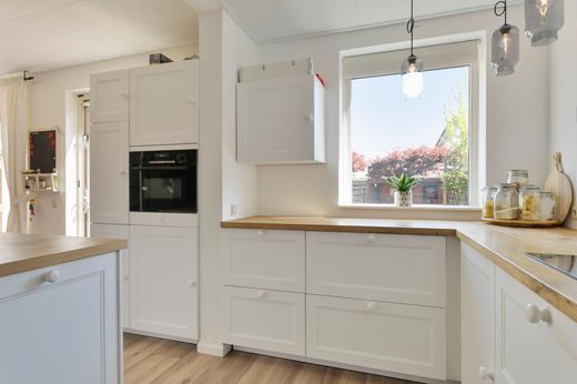 De keuken is 2 jaar geleden vernieuwd, een maatwerk keukeninrichting met een massief houten blad en inbouwapparatuur. Vanuit de keuken is er toegang tot de achtertuin waar tevens een houten berging en tuinoverkapping aanwezig zijn.